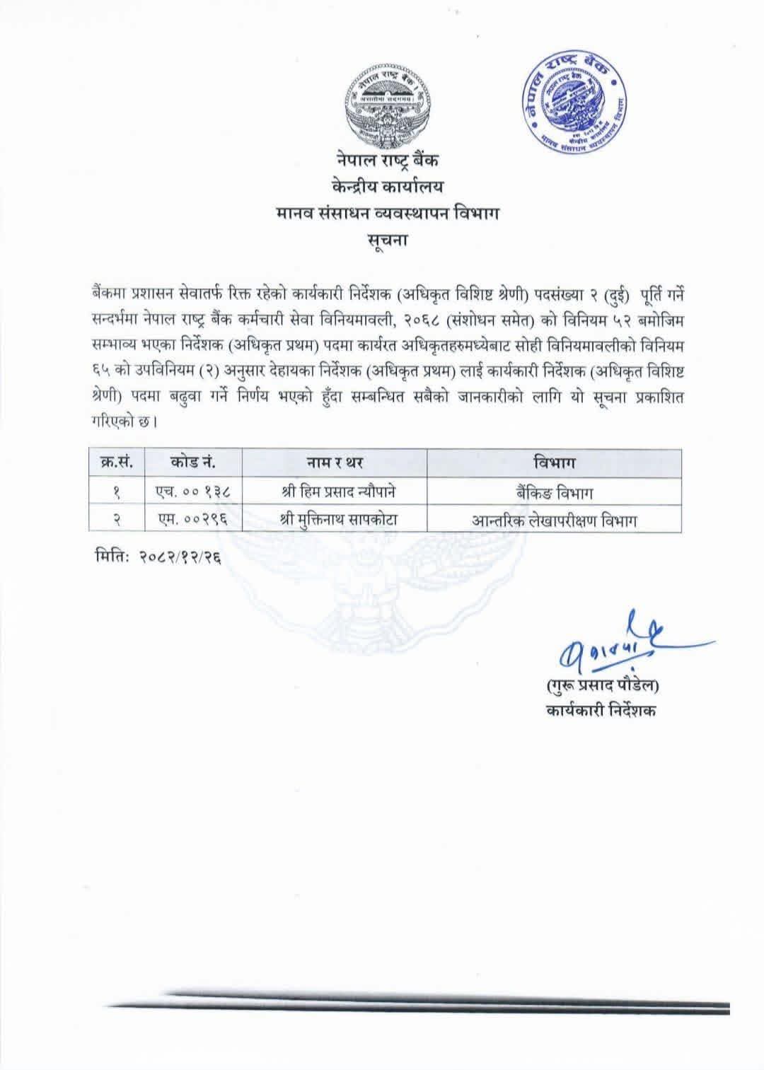 काठमाडौं । नेपाल राष्ट्र बैंकको रिक्त दुई कार्यकारी निर्देशकको पदमा हिम प्रसाद न्यौपाने र मुक्तिनाथ सापकोटाको बढुवा भएको छ। राष्ट्र बैंकको मानव संशाधन व्यवस्थापन विभागले क्रमश पहिलो र दोस्रो बरियताका निर्देशक रहेका उनीहरुलाई रिक्त कार्यकारी निर्देशक पदमा बढुवा गरेकाे हाे ।