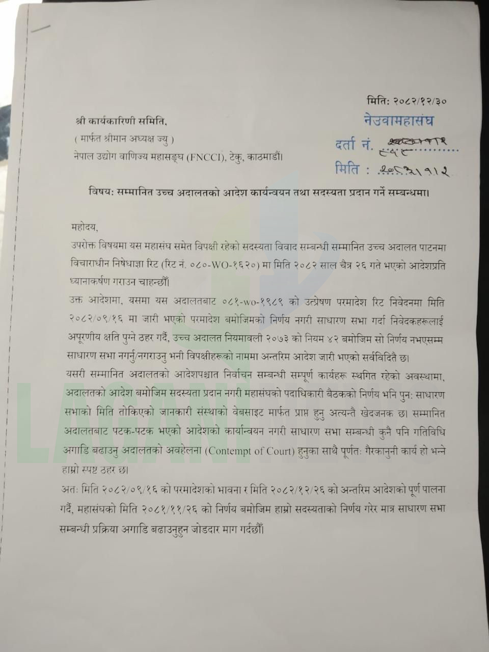 महासंघ समेत विपक्षी रहेको सदस्यता विवाद सम्बन्धी उच्च अदालत पाटनमा विचाराधीन निषेधाज्ञा रिट (रिट नं. ०८०–डब्लूओ–१६२०) मा चैत्र २६ गते भएको आदेशप्रति ध्यानाकर्षण गराएका छन् ।