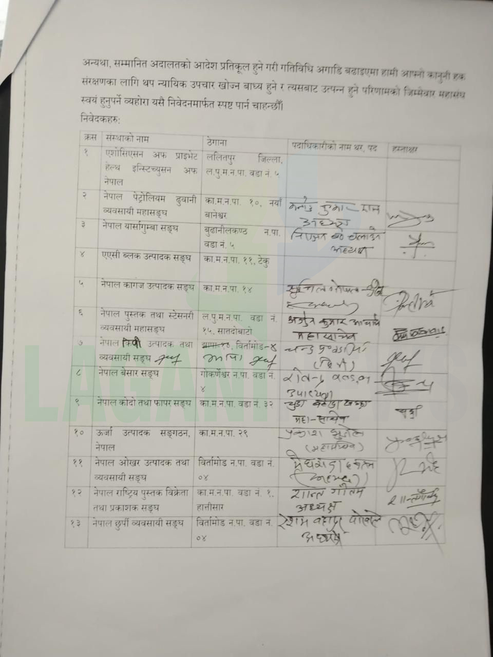 ‘‘पुस १६ गते जारी भएको परमादेश बमोजिमको निर्णय नगरी साधारण सभा गर्दा निवेदकहरूलाई अपूरणीय क्षति पुग्ने ठहर गर्दै, उच्च अदालत नियमावली २०७३ को नियम ४२ बमोजिम सो निर्णय नभएसम्म साधारण सभा नगर्नु÷नगराउनु भनी विपक्षीहरूको नाममा अन्तरिम आदेश जारी भएको सर्वविदितै छ । यसरी सम्मानित अदालतको आदेशपश्चात निर्वाचन सम्बन्धी सम्पूर्ण कार्यहरू स्थगित रहेको अवस्थामा, अदालतको आदेश बमोजिम सदस्यता प्रदान नगरी महासंघको पदाधिकारी बैठकको निर्णय भनि पुनः साधारण सभाको मिति तोकिएको जानकारी संस्थाको वेबसाइट मार्फत प्राप्त हुनु अत्यन्तै खेदजनक छ। सम्मानित अदालतबाट पटक–पटक भएको आदेशको कार्यान्वयन नगरी साधारण सभा सम्बन्धी कुनै पनि गतिविधि अगाडि बढाउनु अदालतको अवहेलना (ऋयलतझउत या ऋयगचत) हुनुका साथै पूर्णतः गैरकानुनी कार्य हो भन्ने हाम्रो स्पष्ट ठहर छ’’ महासंघमा दर्ता भएको निवेदनमा उल्लेख छ ।