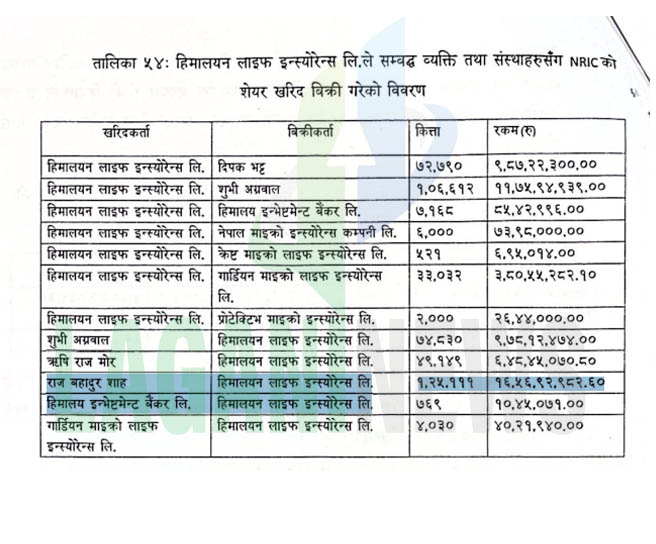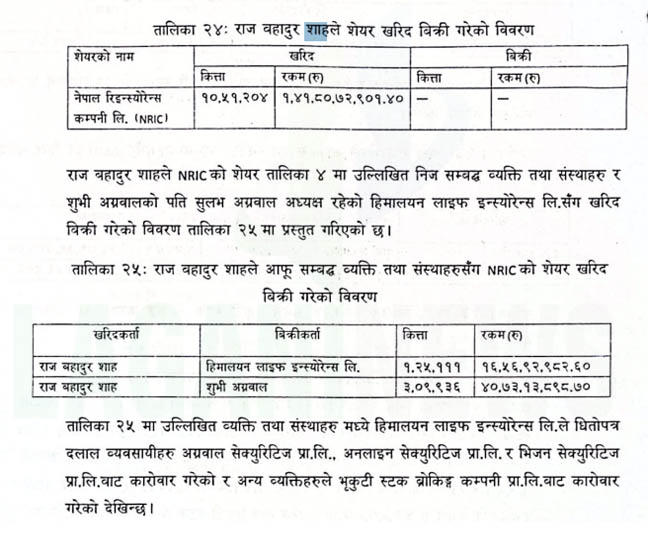त्यसैगरी, शाहले हिमालयन लाइफ इन्स्योरेन्सको १ लाख २५ हजार १११ कित्ता सेयर १६ करोड ५६ लाख ९२ हजार ९८२ रुपैयाँ ६० पैसामा खरिद गरेका छन् ।
