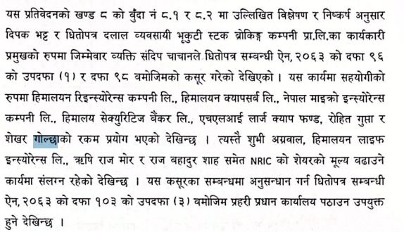 उनीहरुले धितोपत्र सम्बन्धी ऐन, २०६३ को दफा ९६ को उपदफा (१) र दफा ९८ बमोजिमको कसूर भएको देखिएको छ । उक्त कारोवारमा हिमालयन रिइन्स्योरेन्स लि. र एचएलआई लार्ज क्याप फण्डको समेत संलग्नता देखिएको छ ।