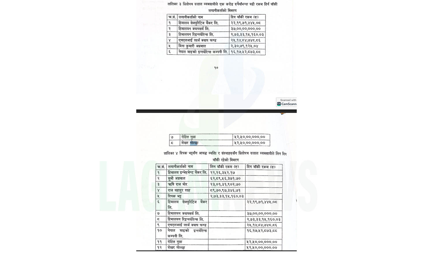 भट्ट र चाचानले यस्तो गैह्र कानूनी काम गर्न हिमालयन रिइन्स्योरेन्स कम्पनी, हिमालयन क्यापसर्व, नेपाल माइक्रो इन्स्योरेन्स कम्पनी, हिमालय सेक्युरिटिज बैंकर, एचएलआई लार्ज क्याप फण्ड, रोहित गुप्ता र शेखर गोल्छाको रकम प्रयोग भएको देखिएको छ ।