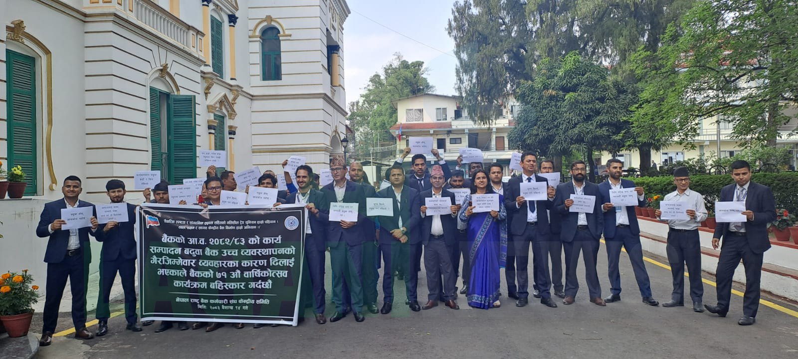 कर्मचारीको हितमा काम नगरेको भन्दै आजको कार्यक्रम बहिस्कार गर्नु परेको राष्ट्र बैंक कर्मचारी संघले जनाएको छ । बार्षिकोत्सवको दिनमा यसरी गेटमा कालो ब्यानर देखाएर विरोध गर्नुपर्दा मन नै अमिलो भएको राष्ट्र बैंक कर्मचारी संघकी निवर्तमान अध्यक्ष गिता पोखरेल लम्सालले बताइन् । ‘आज हामी सबैको दिन हो’ उनले भनिन् ‘हामीले चाहेर होइन, बाध्यताले कार्यक्रम बहिस्कार गर्नुपरेको हो ।’