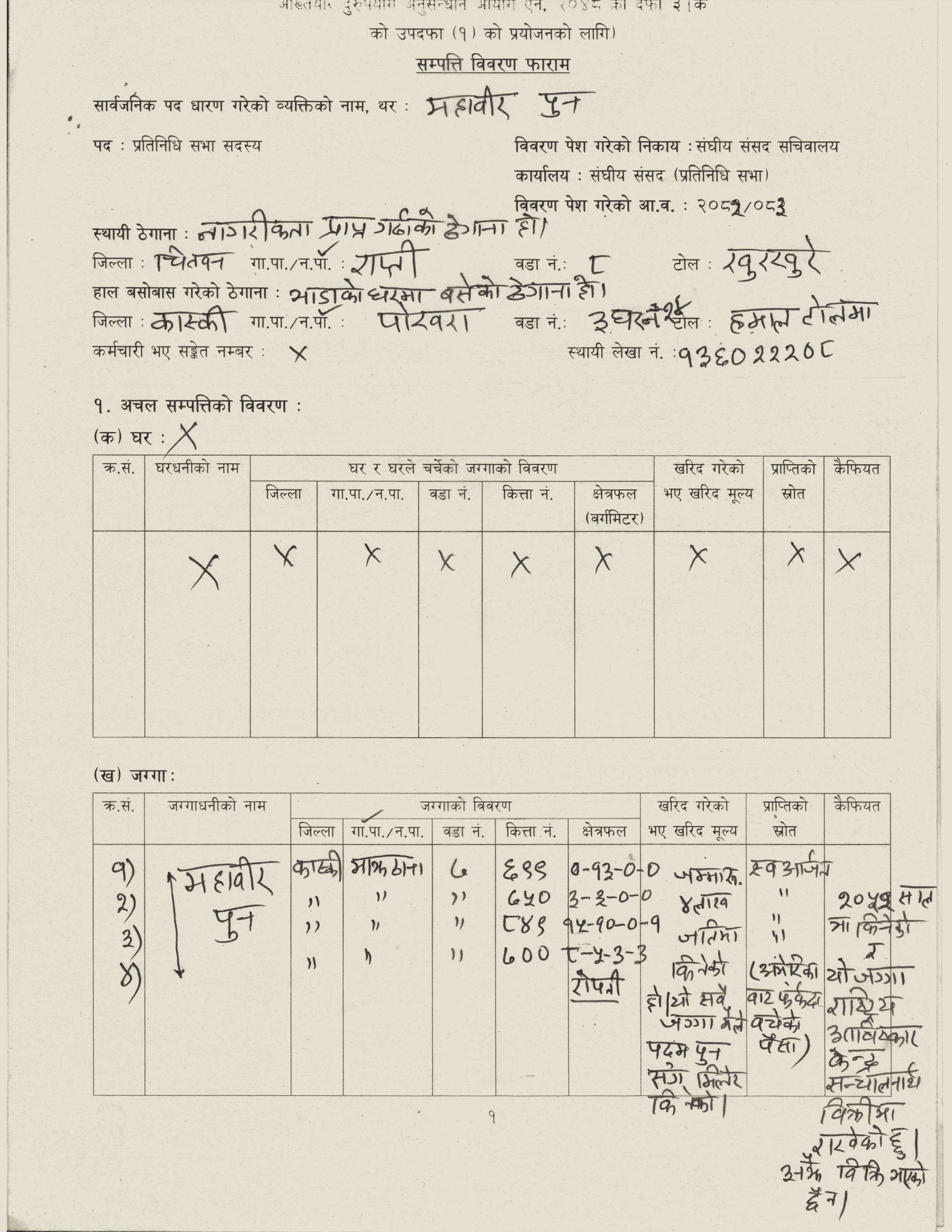 उनले संघीय संसद सचिवालयलाई बुझाएको विवरण सार्वजनिक गरेका छन् । उनले बुझाएको सम्पत्ति विवरण सार्वजनिक गर्र्दै भनेका छन् ‘‘खास गरि महाबीर पुनले राष्ट्रिय आविष्कार केन्द्र खोलेर र आफ्नो किताब बेचेर करोडौं पैसा थुपार्यो भन्ने बिद्वानहरु र रिस गर्ने व्यक्तिहरुले यो हेर्नु होला र छानबिन गर्नु होला ।’’