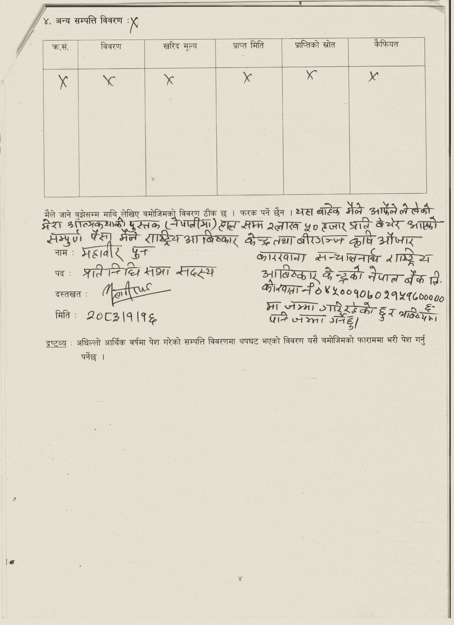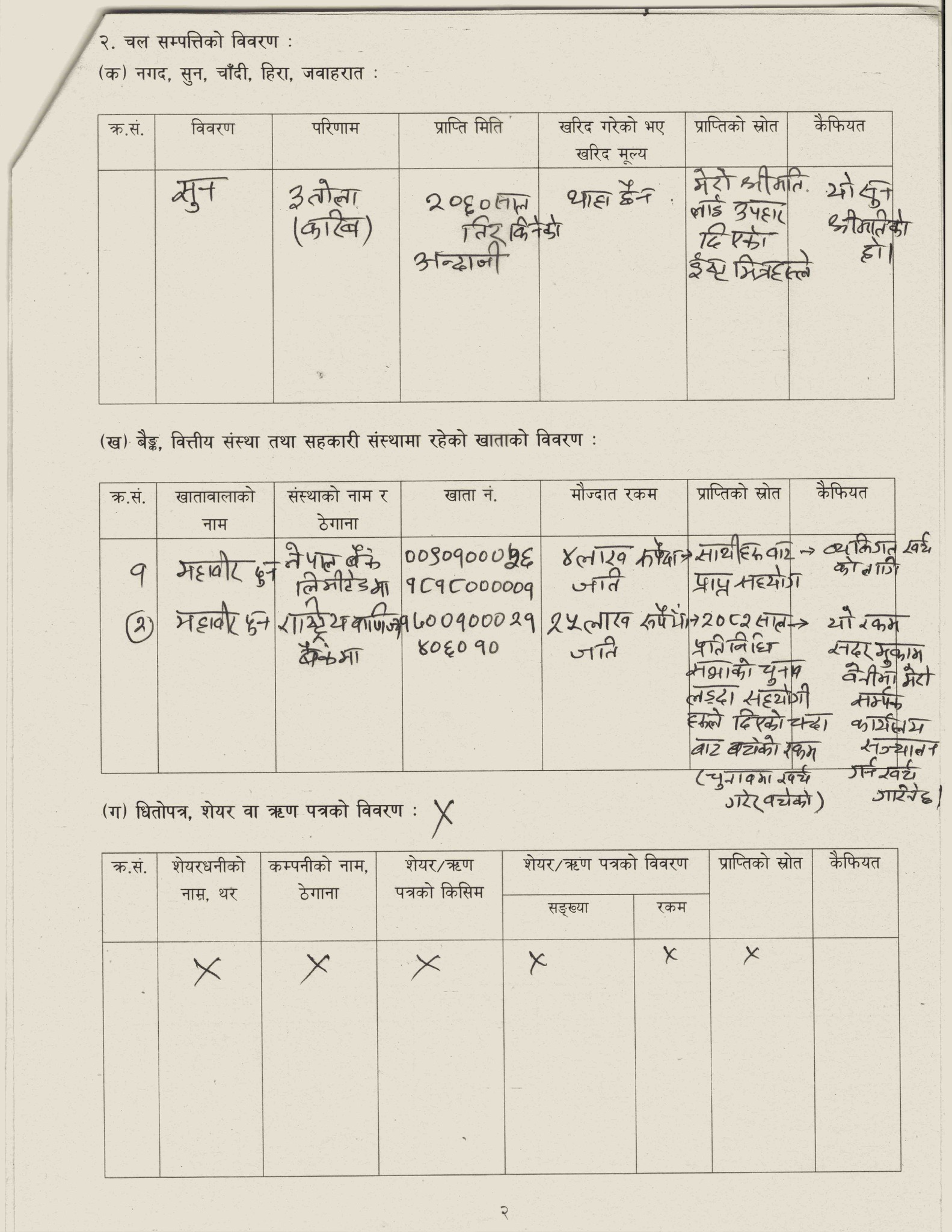 यस्तै राष्ट्रिय वाणिज्य बैंकमा रहेको २५ लाख रुपैयाँ गत फागुन २१ गते भएकोृ निर्वाचनमा खर्च गरेर बाँकी रहेको जनाएका छन् । यो रकम बेनीमा रहेको सम्पर्क कार्यालयमा खर्च गर्ने जनाएका छन् ।