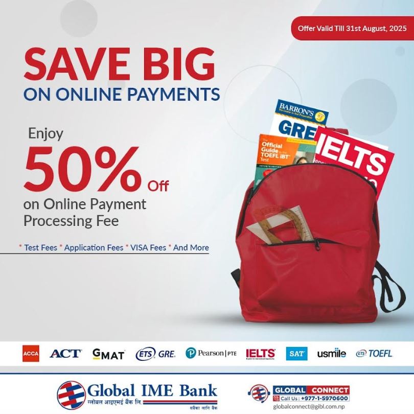 ग्लोबल आइएमई बैंकद्वारा वैदेशिक शिक्षा र भाषा परीक्षा शुल्कमा ५० प्रतिशत छुट