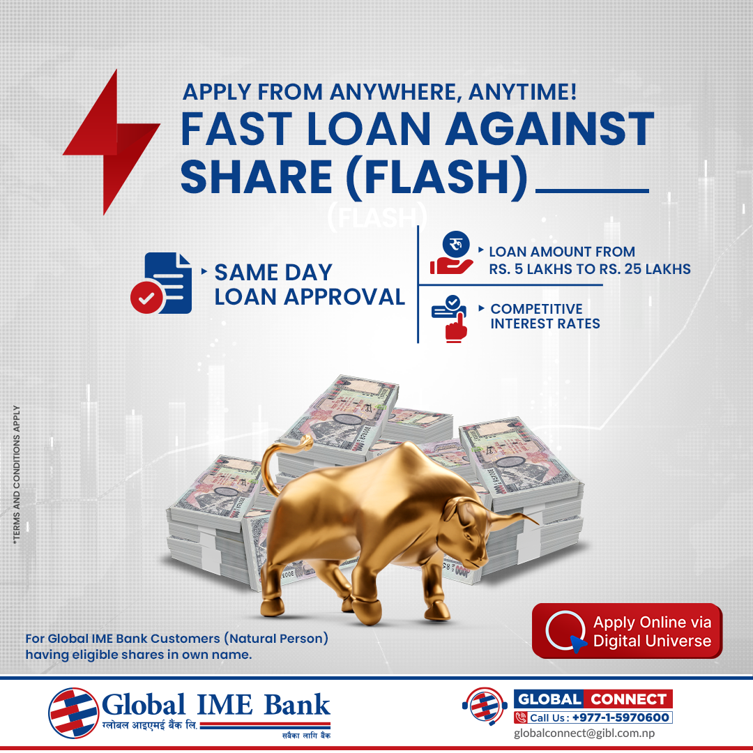 काठमाडौं । ग्लोबल आइएमई बैंकले फास्ट लोन अगेन्स्ट सेयर प्लेटफर्म सार्वजनिक गरेको छ । यसअन्तर्गत इच्छुक[...]