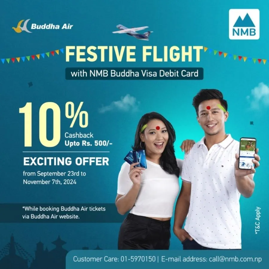 एनएमबी बैंकको बुद्ध भिसा कार्डबाट फ्लाइट टिकेट किन्दा १० प्रतिशत क्यास ब्याक