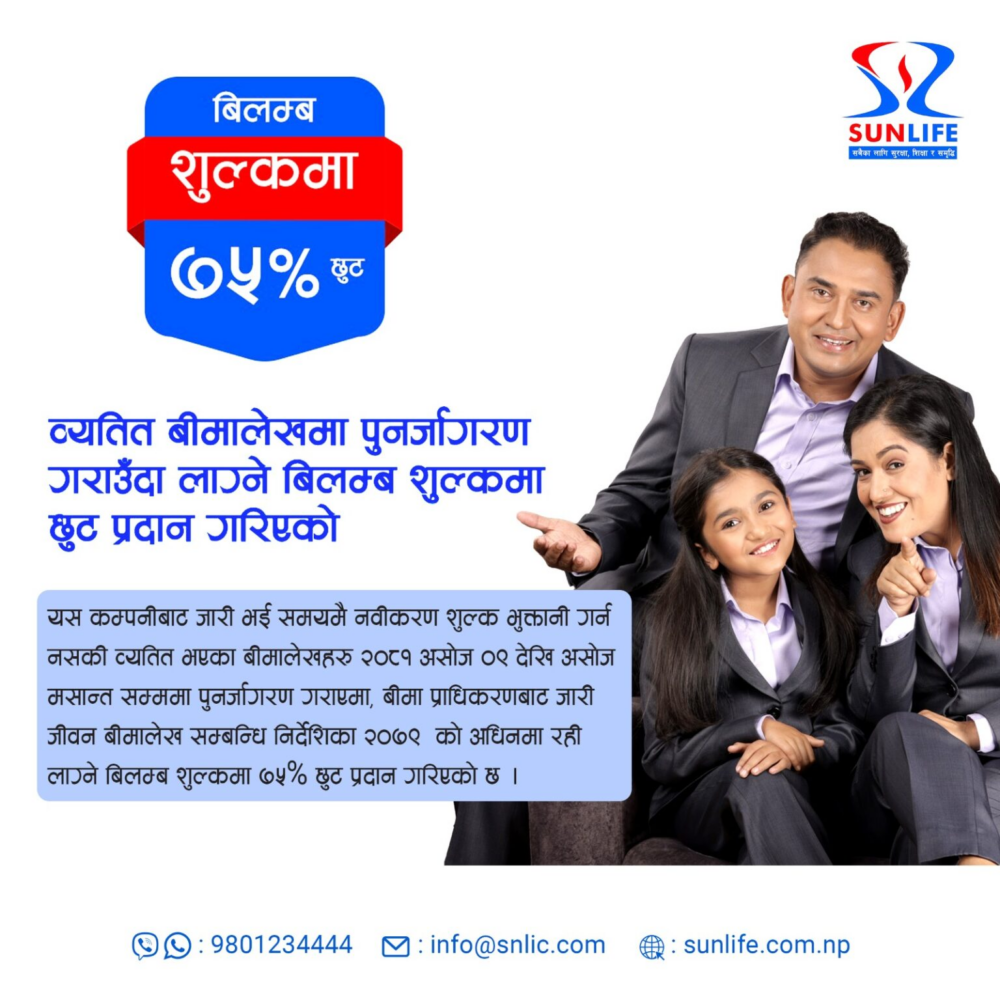 सन नेपाल लाइफले बिलम्ब शुल्कमा ७५ प्रतिशत छुट दिने