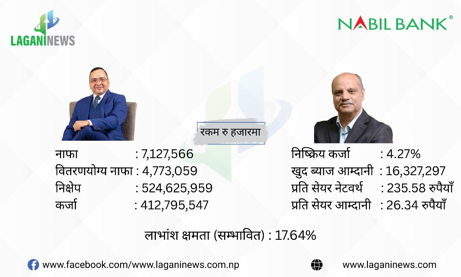 नबिल बैंकको नाफा ७ अर्ब १२ करोडः लाभांश दिने क्षमता ५४.८७ प्रतिशतले बढ्यो, अन्य सूचक कस्ता ?