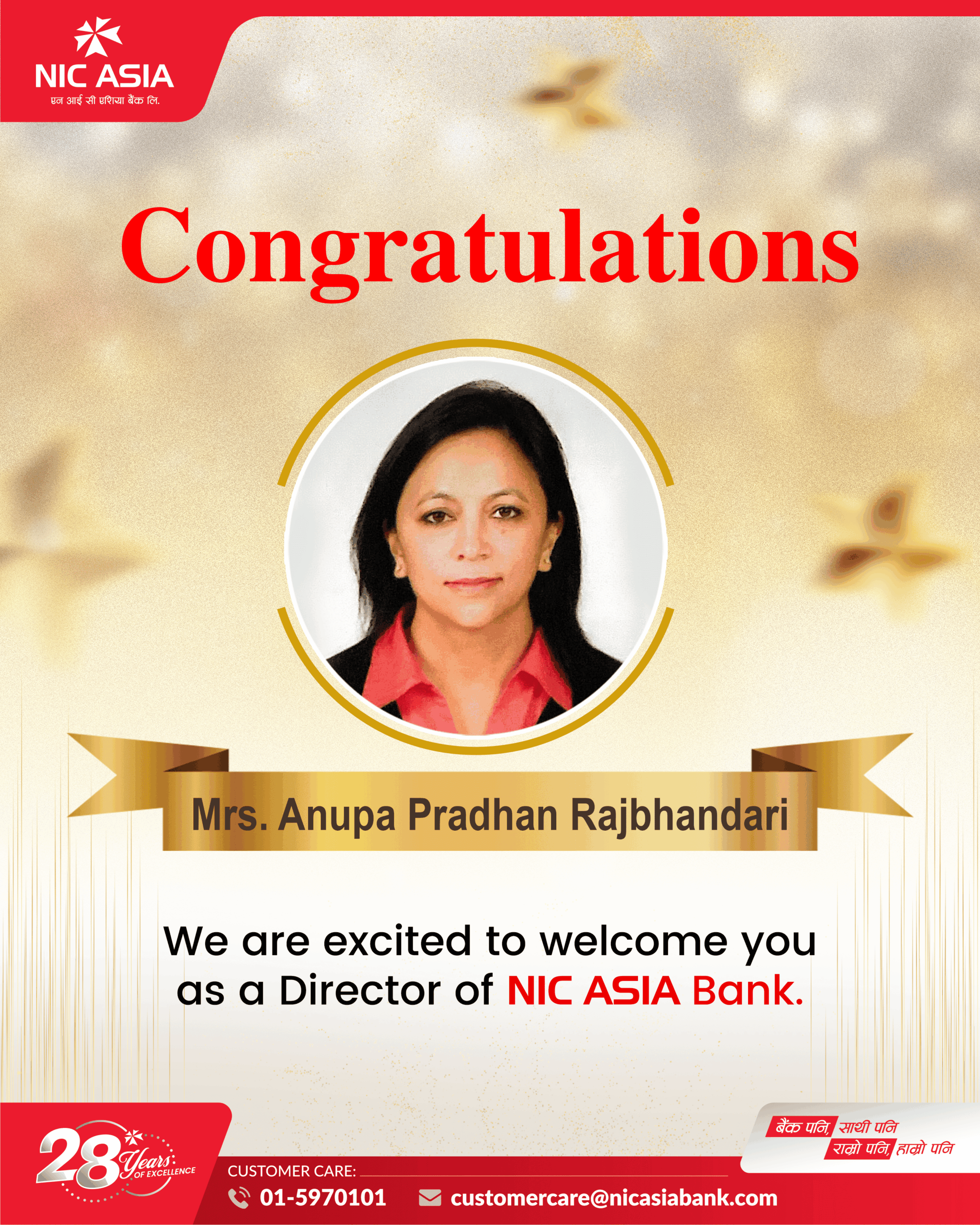एनआईसी एशिया बैंकको सञ्चालकमा अनुपा प्रधान राजभण्डारी नियुक्त