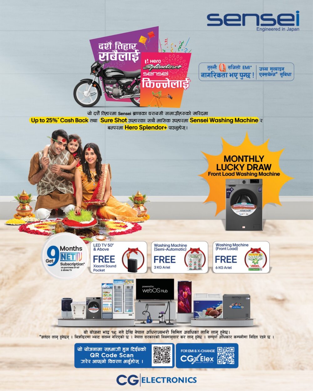 काठमाडौं । दशैं, तिहार र छठजस्ता नेपालीहरूको चाडपर्वलाई लक्षित गर्दै सीजी इलेक्ट्रोनिक्सले विशेष अफर ल्याएको छ।[...]