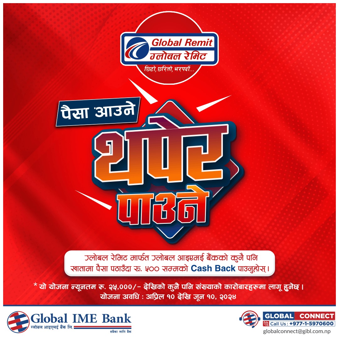 ग्लोबल आइएमई बैंकको ‘पैसा आउने, थपेर पाउने’ योजना, ग्लोबल रेमिटमार्फत पैसा पठाउँदा विशेष क्यासब्याक