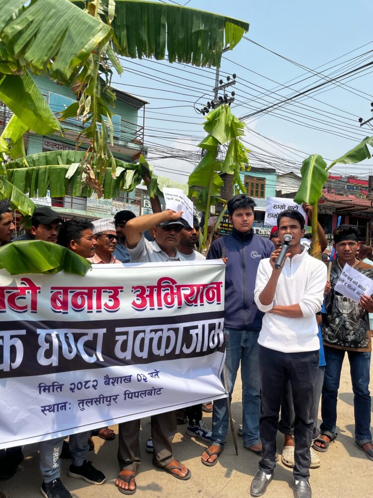 स्थानीय युवाहरुले सडक निर्माणको माग गर्दै सडकमै रोपे केराको बोट