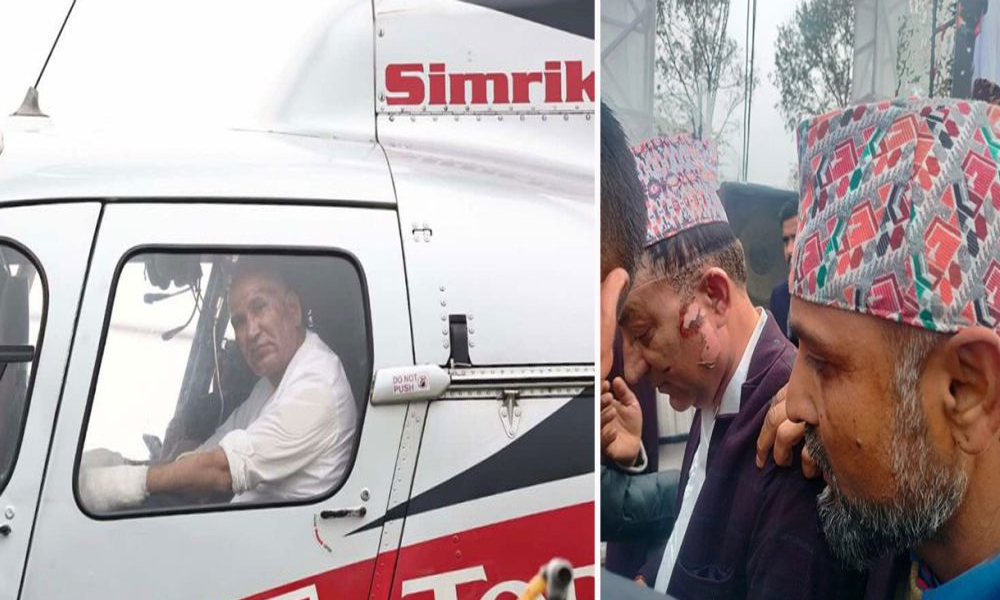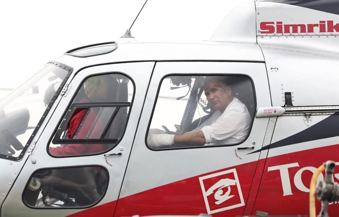 अर्थमन्त्री पौडेल र पोखराका मेयर आचार्यलाई हेलिकप्टरबाट काठमाडौं ल्याइँदै
