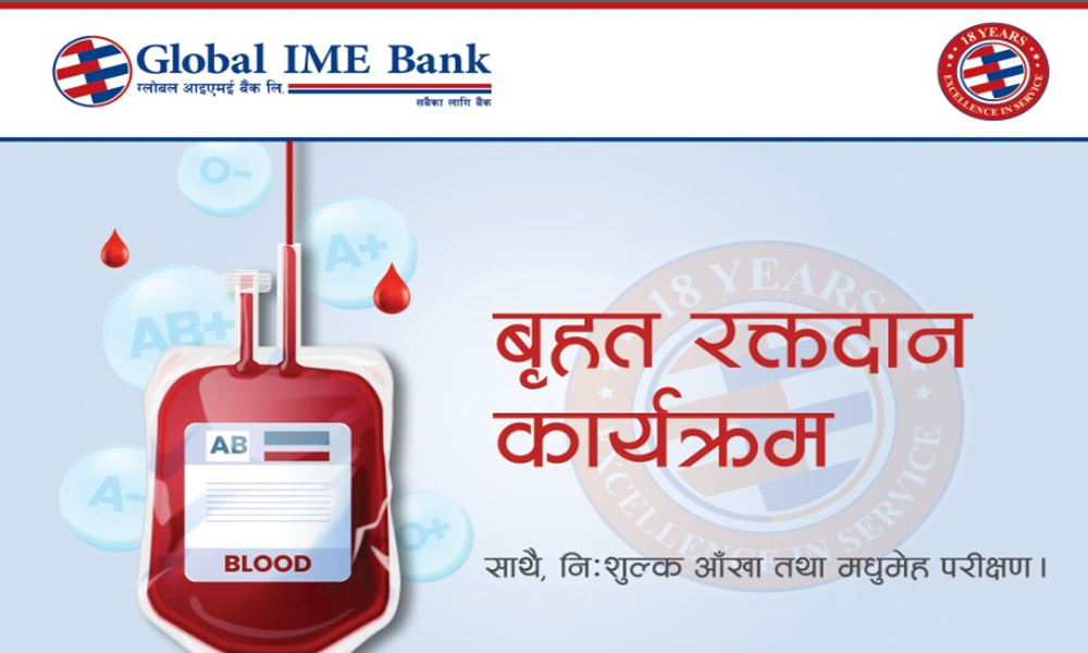 काठमाडौं । ग्लोबल आइएमई बैंकले आफ्नो १८औं वार्षिकोत्सवको अवसरमा वृहत रक्तदान कार्यक्रमको आयोजना गरेको छ ।[...]
