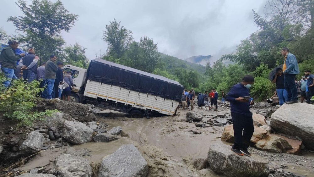 सिन्धुलीको खाङ्साङ बेसी खोलामा ट्रक फस्दा सडक अवरुद्ध