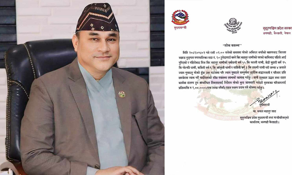 कैलाली । बझाङको बुङ्गल नगरपालिका–१० टुमेडागाउँमा पहिरोमा परी मृत्यु भएका परिवारलाई सुदूरपश्चिम प्रदेश सरकारले प्रतिव्यक्ति रु[...]