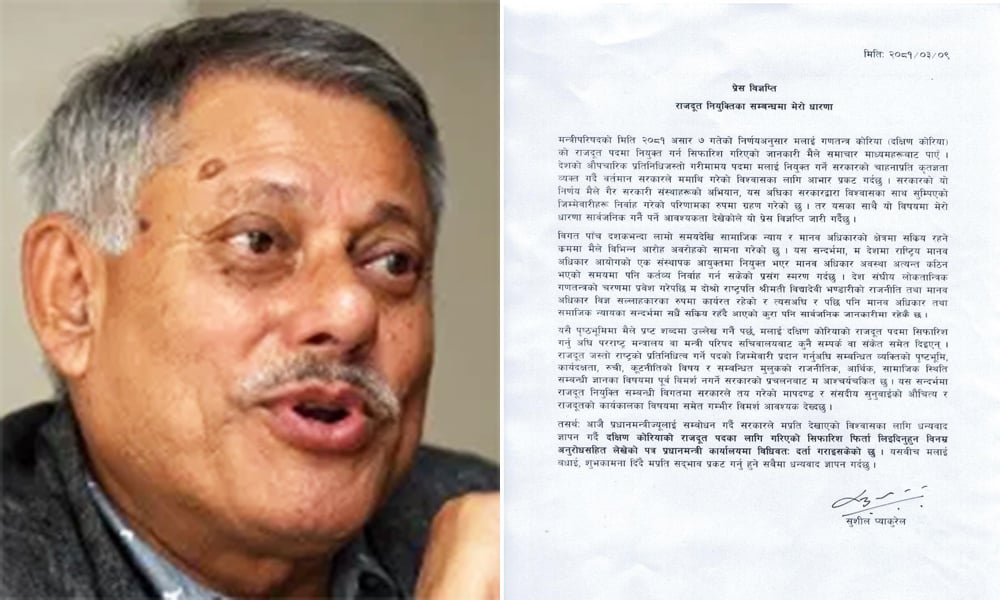 सुशील प्याकुरेलले प्रधानमन्त्रीलाई पत्र लेख्दै अस्वीकार गरे राजदूत पद