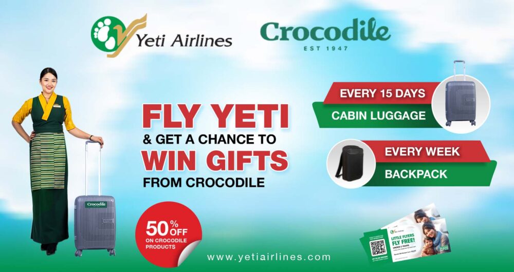 यती एयरलाइन्समा उडान भर्दा क्रोकोडाइल लगेज तथा ब्यागप्याक उपहार पाइने
