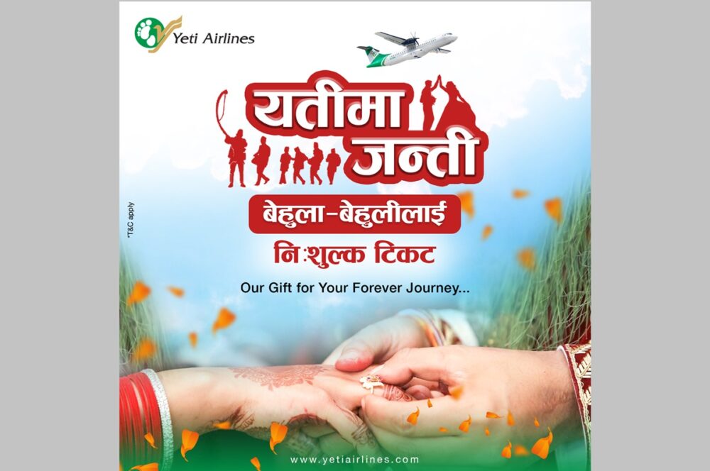 काठमाडौं । यती एयरलाइन्सले विवाह महिनालाई विशेष बनाउँदै ‘यतीमा जन्ती’ योजना सार्वजनिक गरेको छ। यस योजनाअन्तर्गत[...]