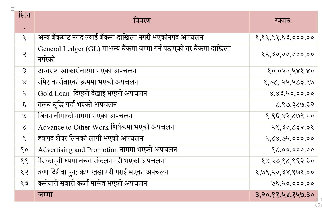 The Central Investigation Bureau (CIB) of Nepal Police has concluded that the scam took place in connivance with the bank’s former chairman, former CEO, directors and employees. The Bureau had submitted the district government lawyer to Banke on July 14.