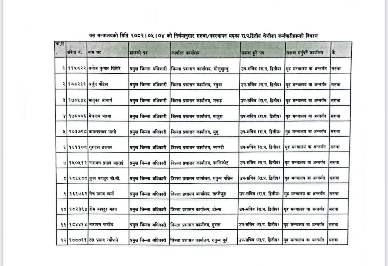 CdOs of Solukhumbu, Rasuwa, Manang, Bajura, Mugu, Myagdi, Kalikot, Rukum West, Taplejung, Dolpa, Humla and Rukum East have been transferred by the Ministry of Home Affairs.