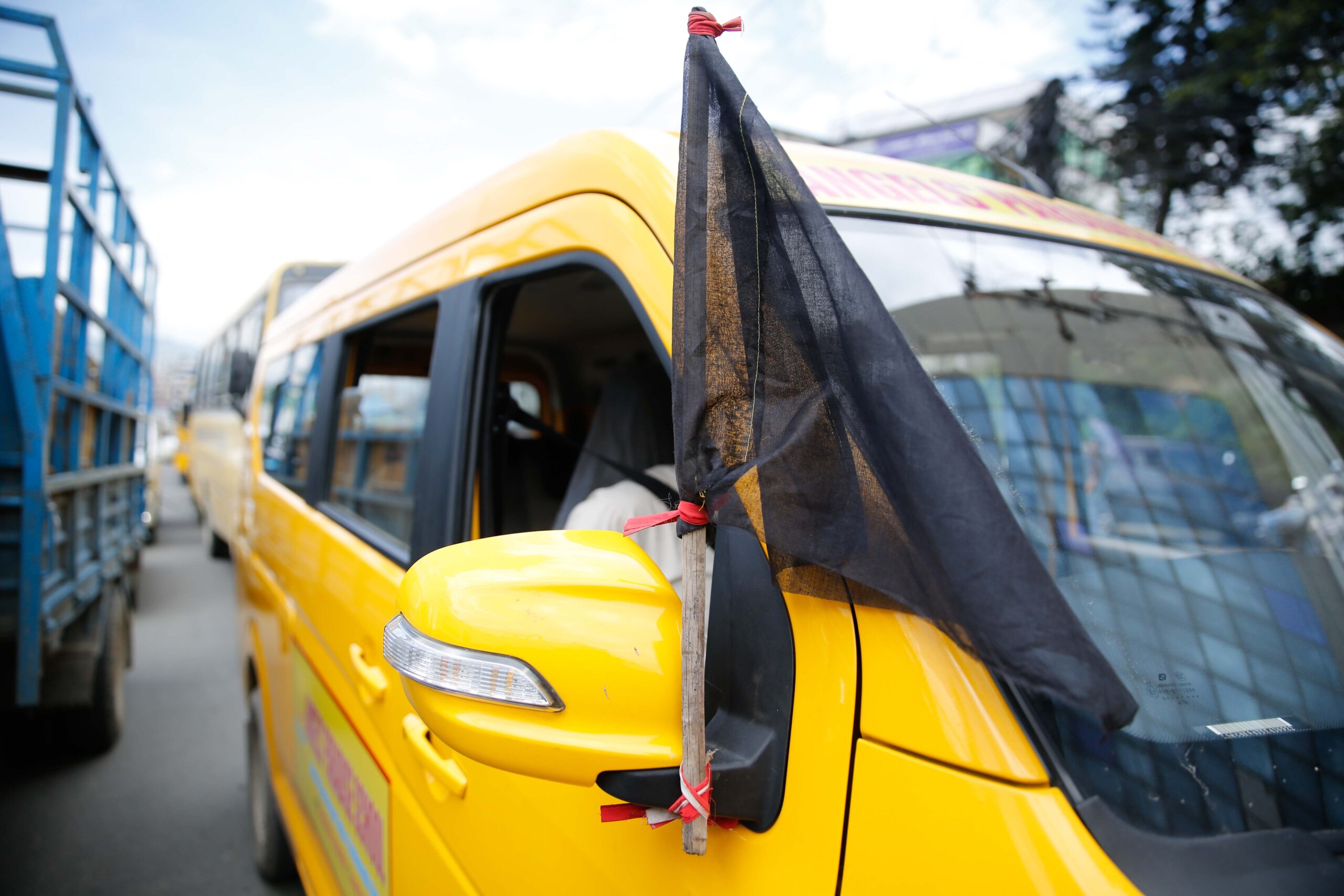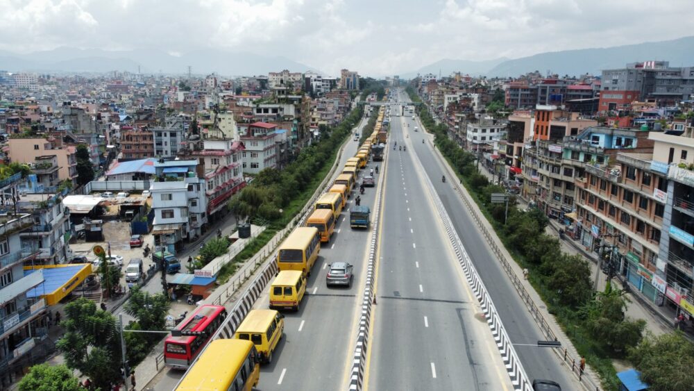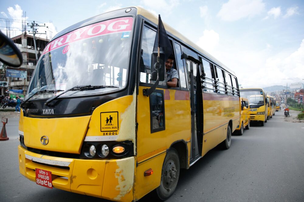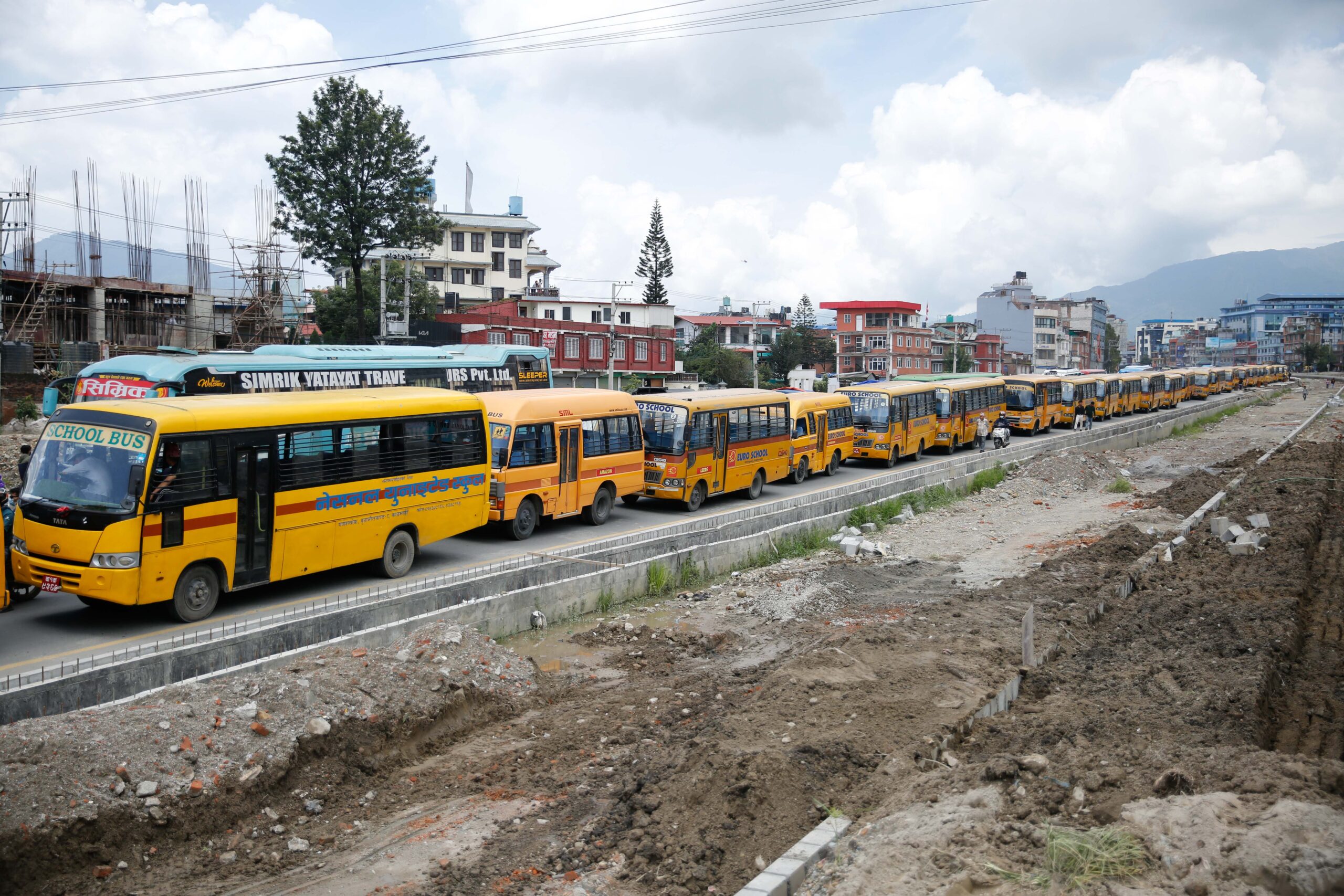 Kathmandu. Private school operators today staged a rally of school buses at The Kathmandu Ring Road. PABSON, National PABSON, HISSAN, APEN and NMA jointly took out the rally at The Ring Road in Kathmandu Valley. A line of private school buses has been seen in one lane of the ring road.