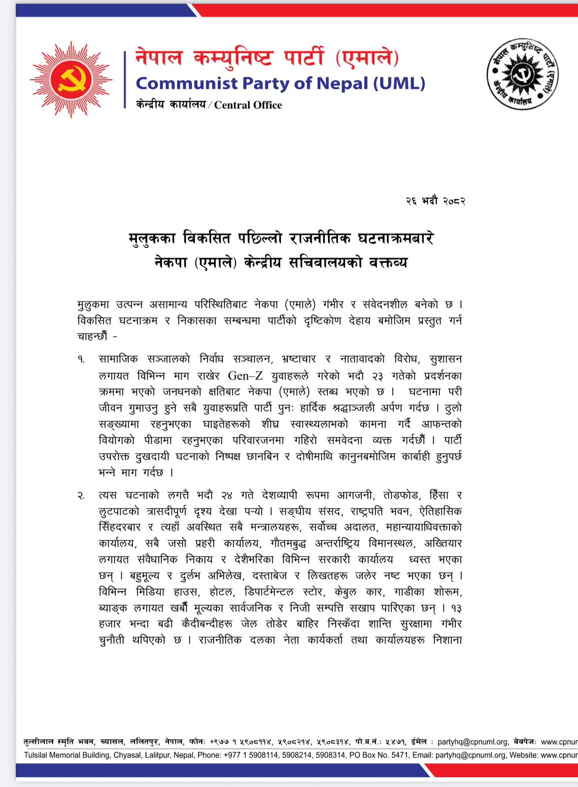 The CPN-UML has said that the entire nation is shocked by these developments which have pushed the country back for decades in terms of development. The party has expressed deep concern over the terrible destruction suffered by the nation. They have demanded that the culprits be identified and strict legal action should be taken.