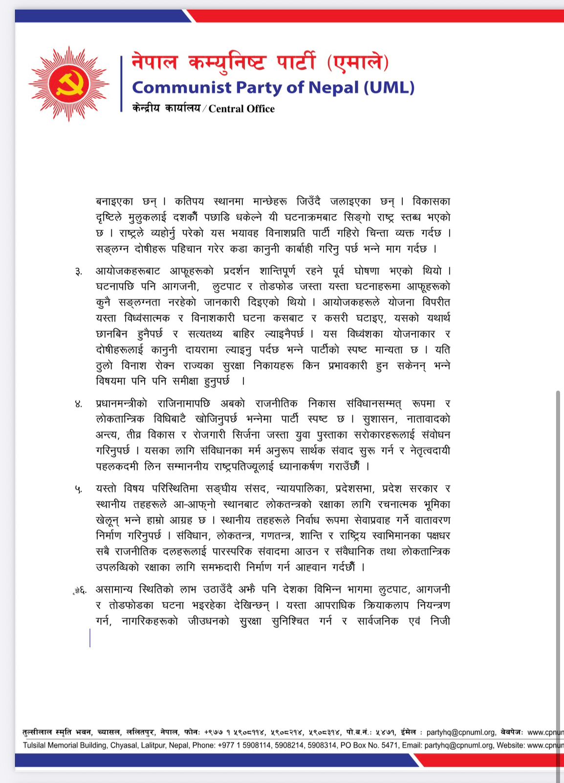 Taking advantage of the unusual situation, incidents of looting, arson and vandalism are still taking place in various parts of the country. “We have drawn the serious attention of all security agencies including the Nepal Army to control such criminal activities, ensure the safety of life and property of citizens and protect public and private property,” the statement reads.