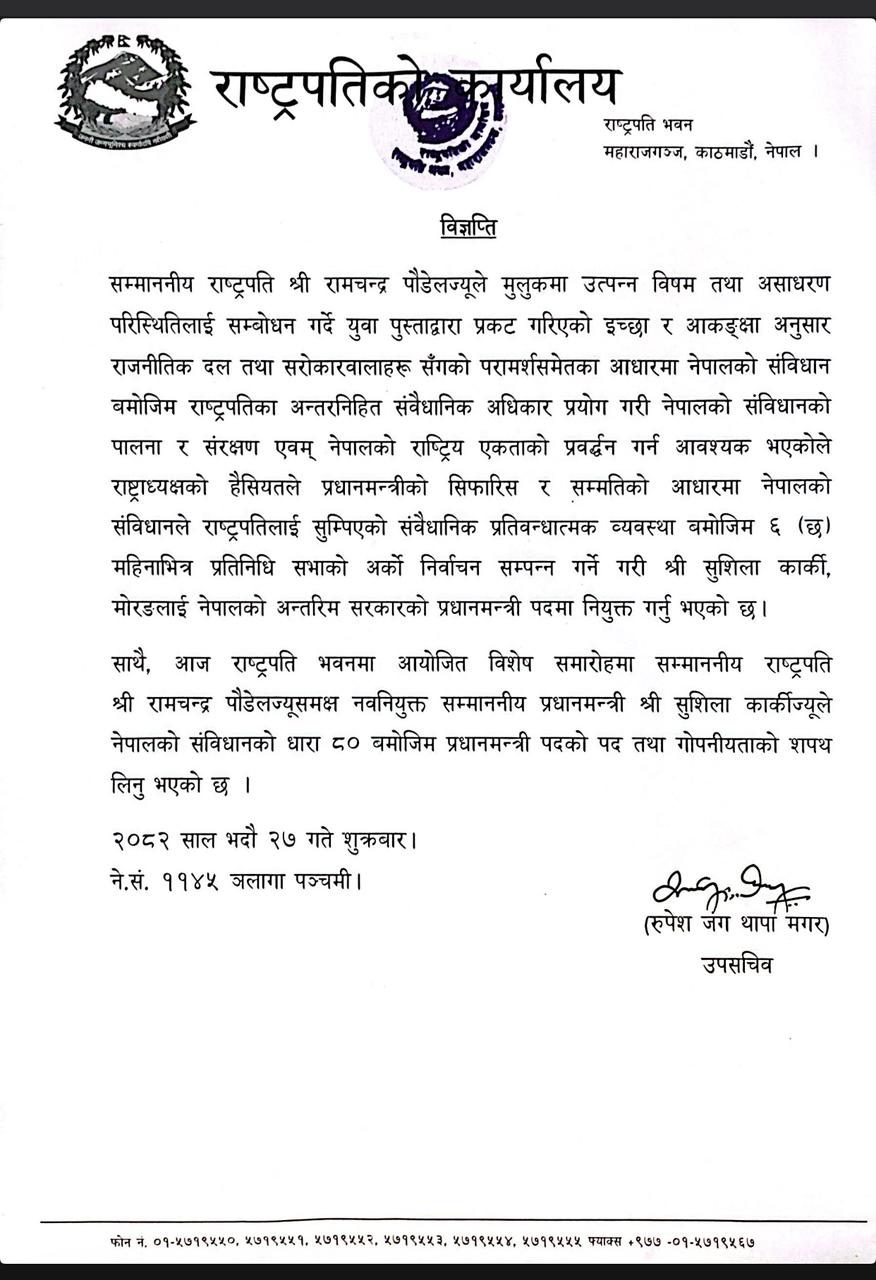 Addressing the difficult and extraordinary situation in the country, President Poudel said that it is necessary to follow and protect the Constitution of Nepal and promote Nepal’s national unity by exercising the inherent constitutional powers of the President as per the Constitution of Nepal as per the wishes and aspirations expressed by the younger generation and also on the basis of consultation with the political parties and stakeholders. Karki has been appointed as the Prime Minister of the interim government with the aim of holding the next election of the House of Representatives within 6 months.