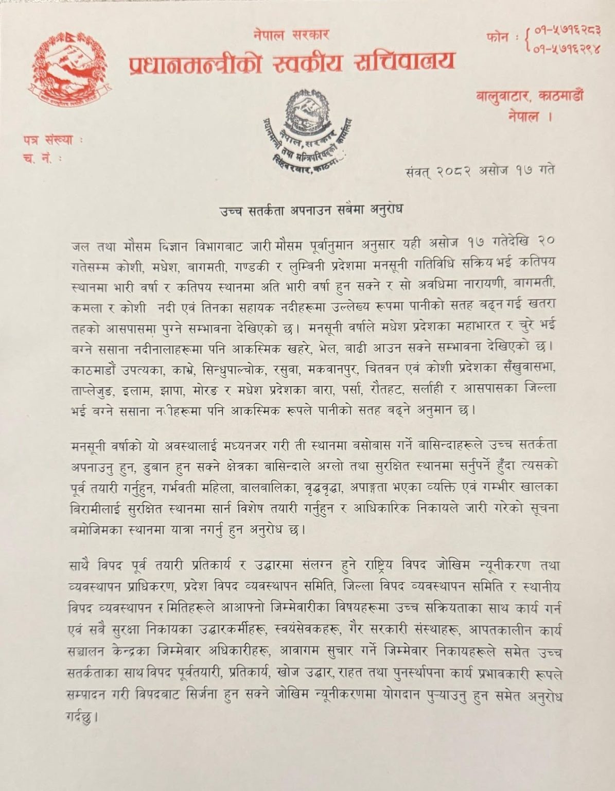 Kathmandu. KATHMANDU: The Office of the Prime Minister and Council of Ministers has urged one and all to adopt high alertness based on the forecast issued by the Department of Hydrology and Meteorology, which is likely to increase risk of flood and landslide following heavy rainfall in different parts of the country until October 3.