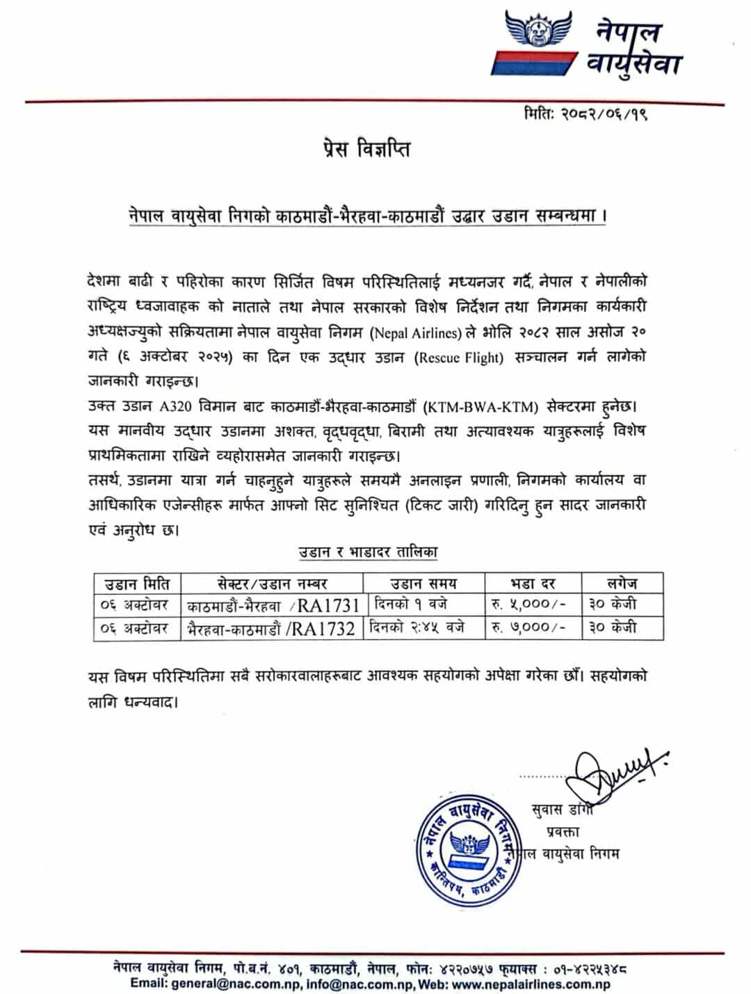 The fare from Kathmandu to Bhairahawa has been fixed at Rs 5,000 and from Bhairahawa to Kathmandu to return to Kathmandu at Rs 7,000. The corporation has said that it is preparing to operate chartered flights citing the lack of smooth road transport and the influx of passengers returning to Kathmandu after Dashain. The corporation is preparing to charter aircraft especially for the people with disabilities who have taken ticket to go abroad for employment.