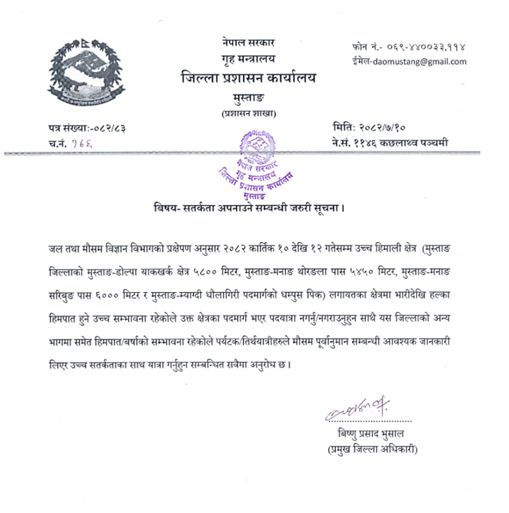 Mustang. The District Administration Office, Mustang has urged the trekkers not to travel on the touristic trekking route.