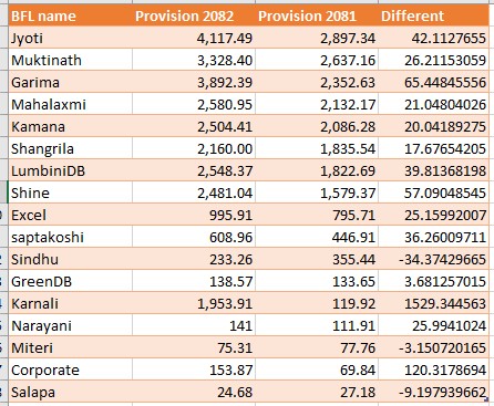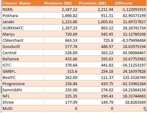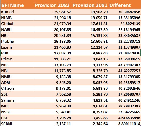 The amount allocated by banks and financial institutions for loan loss provision has increased significantly in the same period of the current fiscal year compared to the two months of the last fiscal year.TAG_OPEN_div_82 The loan loss provision of commercial banks has increased by 23.16 percent compared to the previous fiscal year. Similarly, the growth rate of development banks and finance companies by 43.41 percent has increased.
