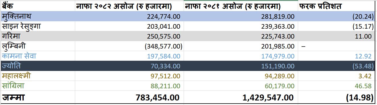 In the first quarter of the current fiscal year, the net profit of Garima Bikas Bank, Kamana Sewa Bikas Bank, Mahalaxmi Bikas Bank and Shangrila Development Bank has increased. Profit of Muktinath Bikas Bank, Sine Resunga Development Bank and Jyoti Bikas Bank has decreased.