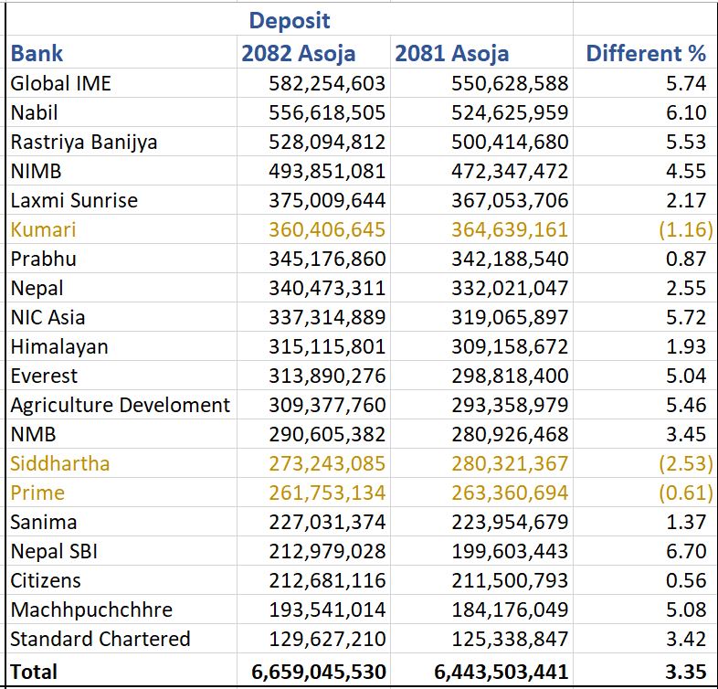 Global IME Bank’s deposit has increased by 5.74 percent to Rs 582.25 billion, NIC Asia Bank by 5.72 percent to Rs 337.31 billion and Rastriya Banijya Bank by 5.53 percent to Rs 528.09 billion.