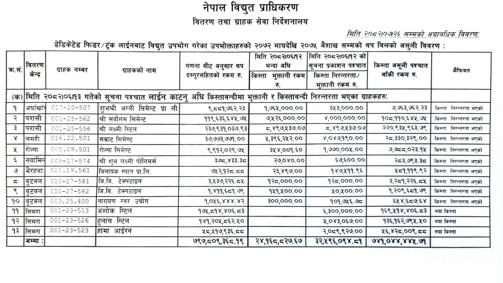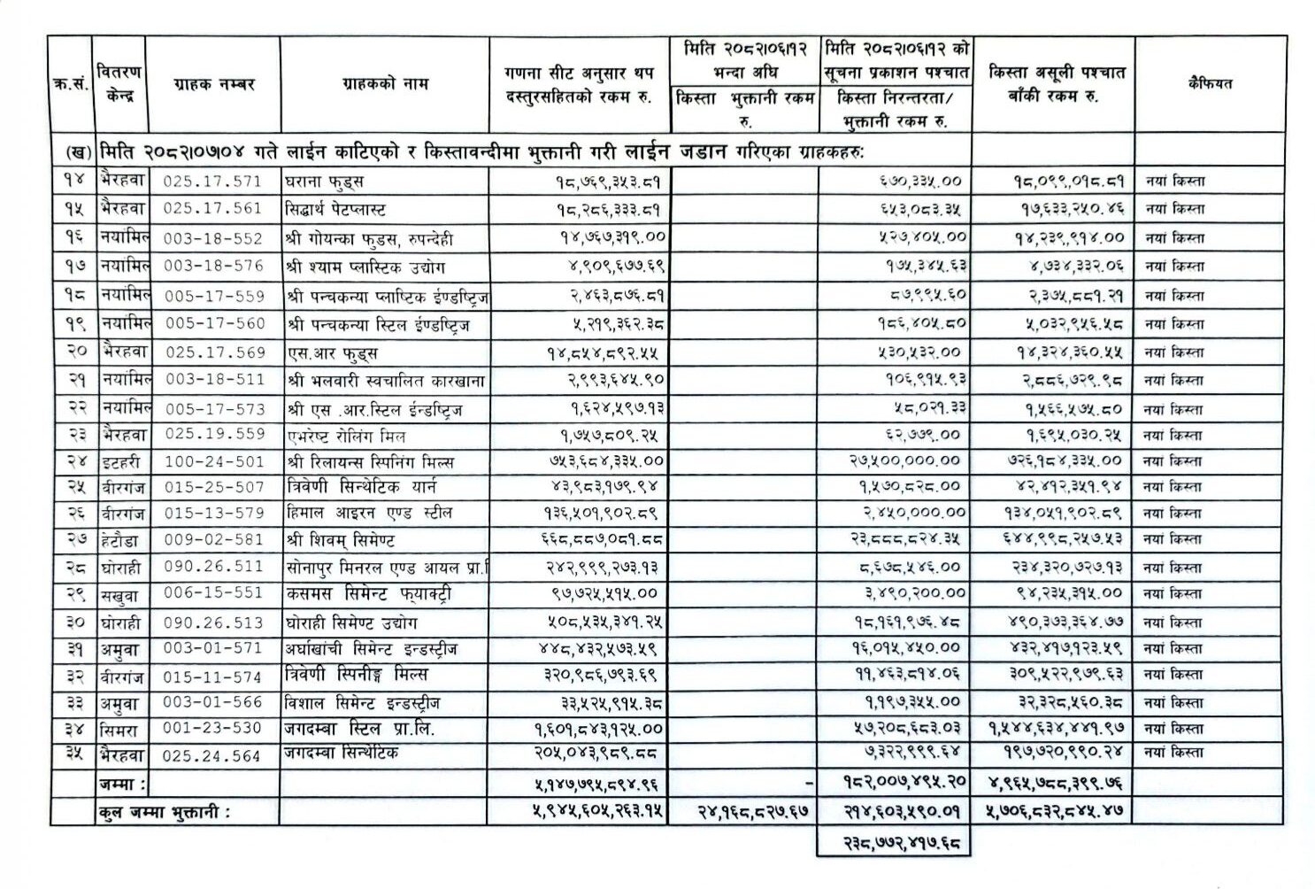 As many as 10 industries that had started paying dues earlier but did not continue with the installments have continued with the installments. Similarly, Nepal Electricity Authority (NEA) has collected Rs 238.72 million from 35 industries.