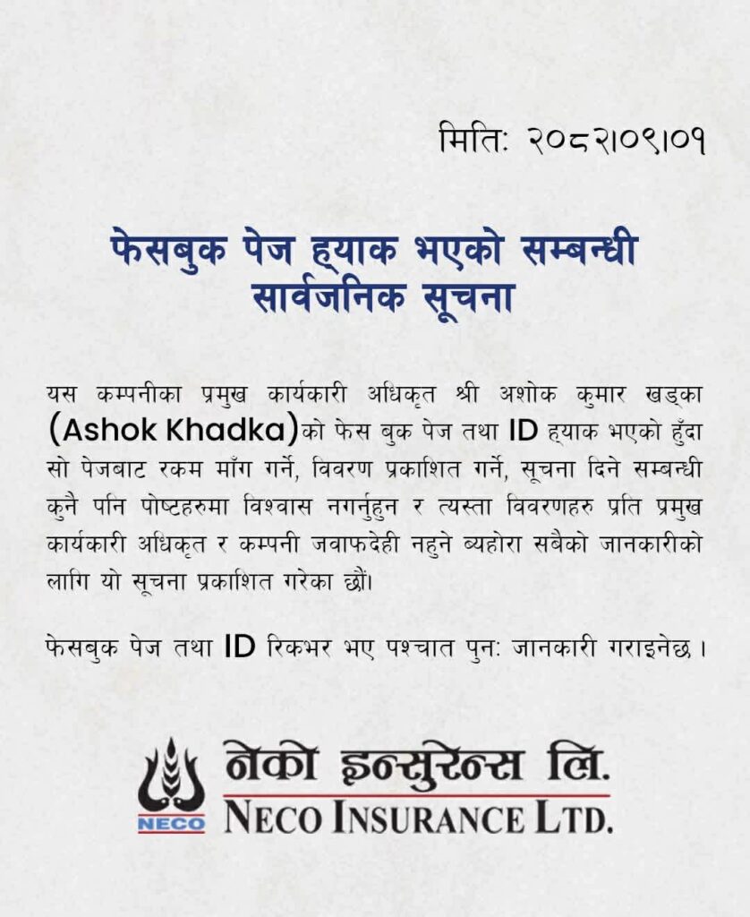 “The CEO and the company will not be liable for any details, information or financial transactions arising out of the hack activity,” the notice said. The company has said that it will be officially informed once the Facebook page and ID are recovered again. Neco Insurance has requested everyone to be cautious and not believe any requests, information or financial demands received through Facebook in the name of CEO Khadka.