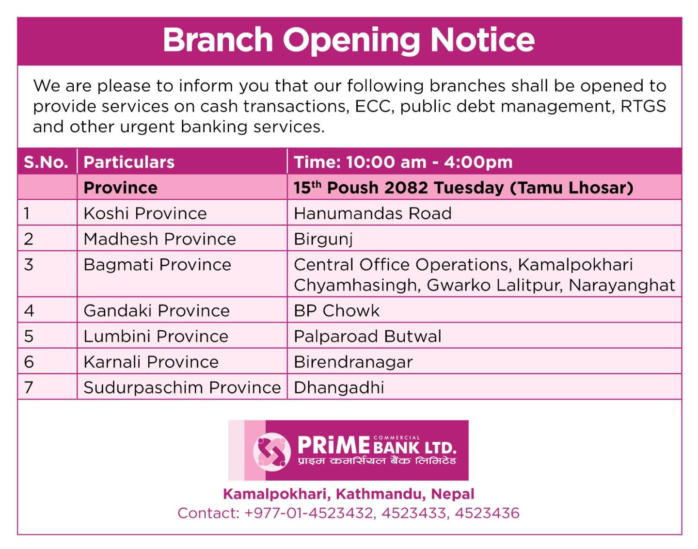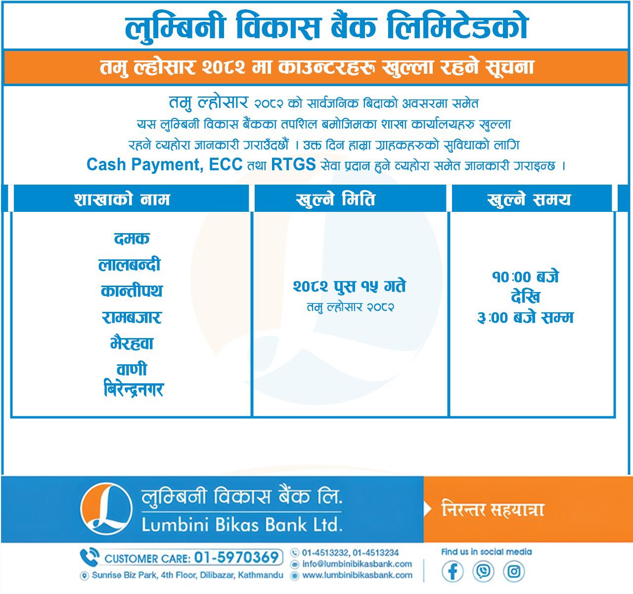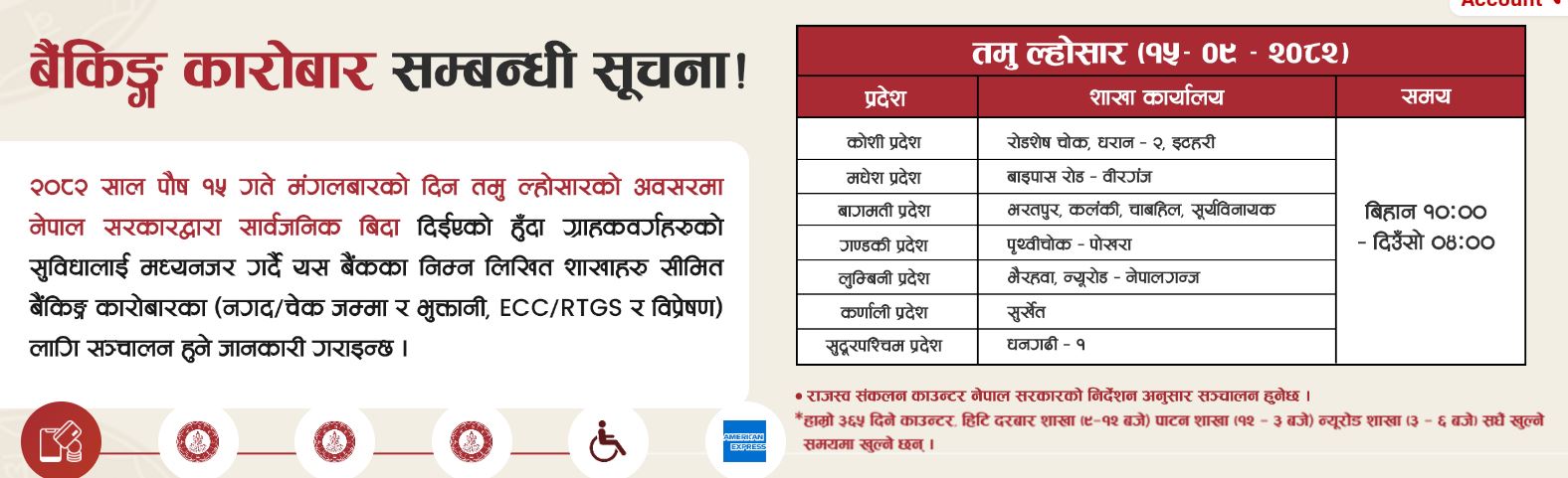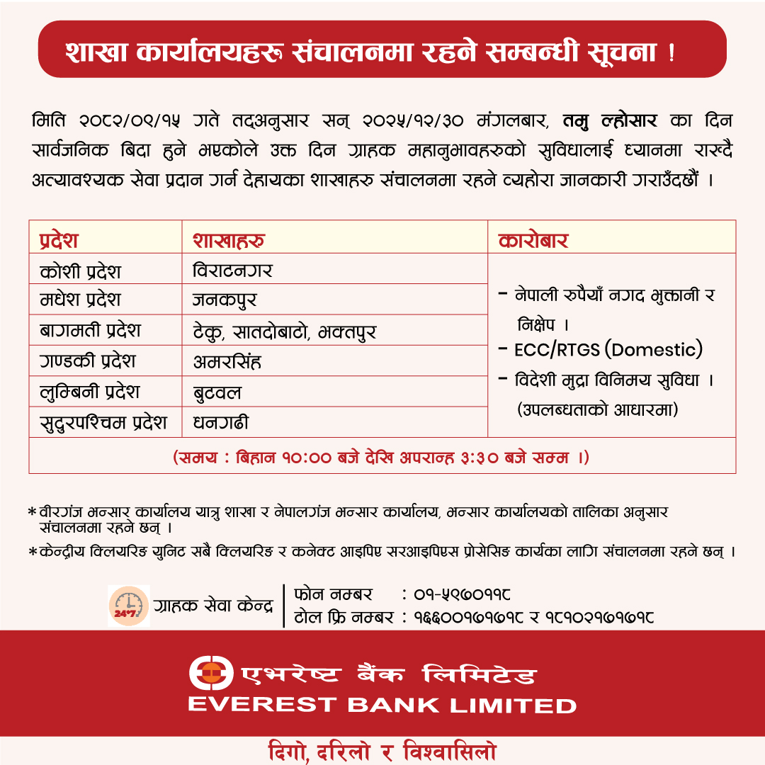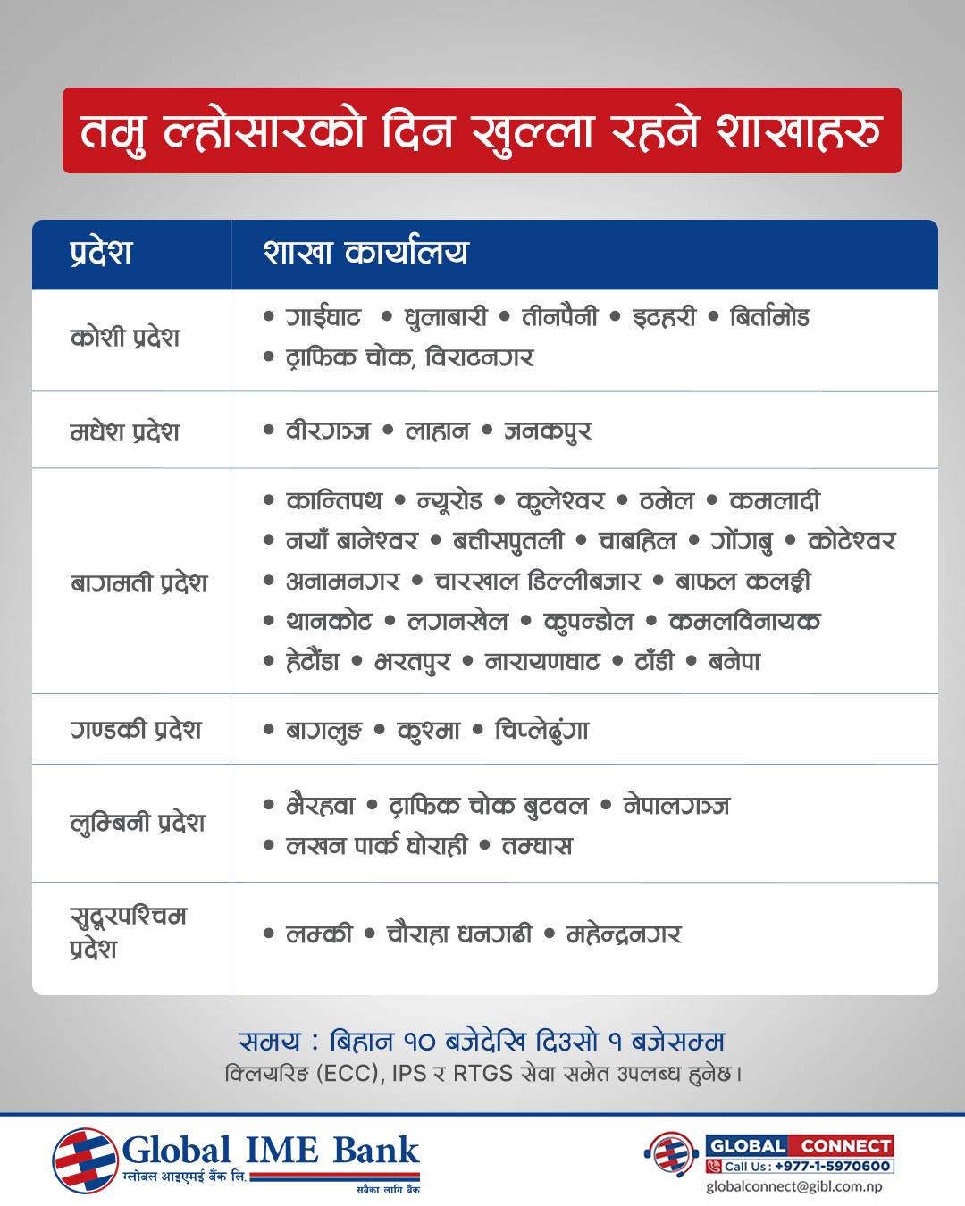 The government has declared a public holiday on the day of Tamu Lhosar. Although the government has declared a public holiday, various banks and financial institutions have started providing services by opening some branches.