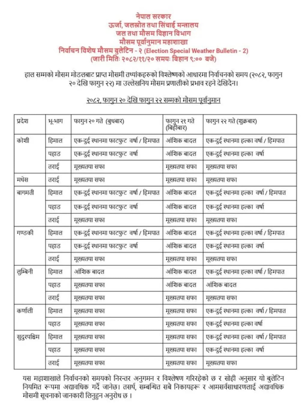 Kathmandu. The Department of Hydrology and Meteorology has made public the weather forecast for the upcoming elections period. According to the Meteorological Forecasting Division, there is a possibility of light rain or snowfall in most of the provinces based on the available weather data and weather model.