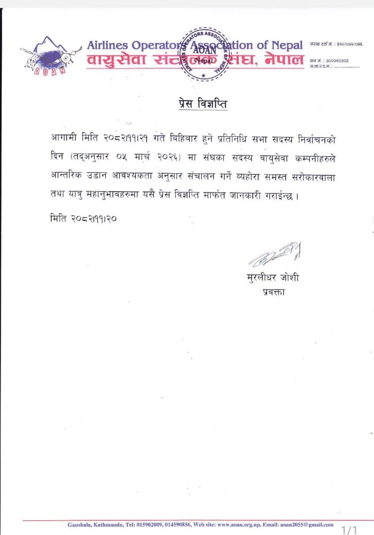 Kathmandu. Domestic flights will also be operated on the day of the election to the House of Representatives. Issuing a press release today, the Airlines Operators Association of Nepal (NACA) has informed that the airlines associated with the association will operate domestic flights as per the requirement.
