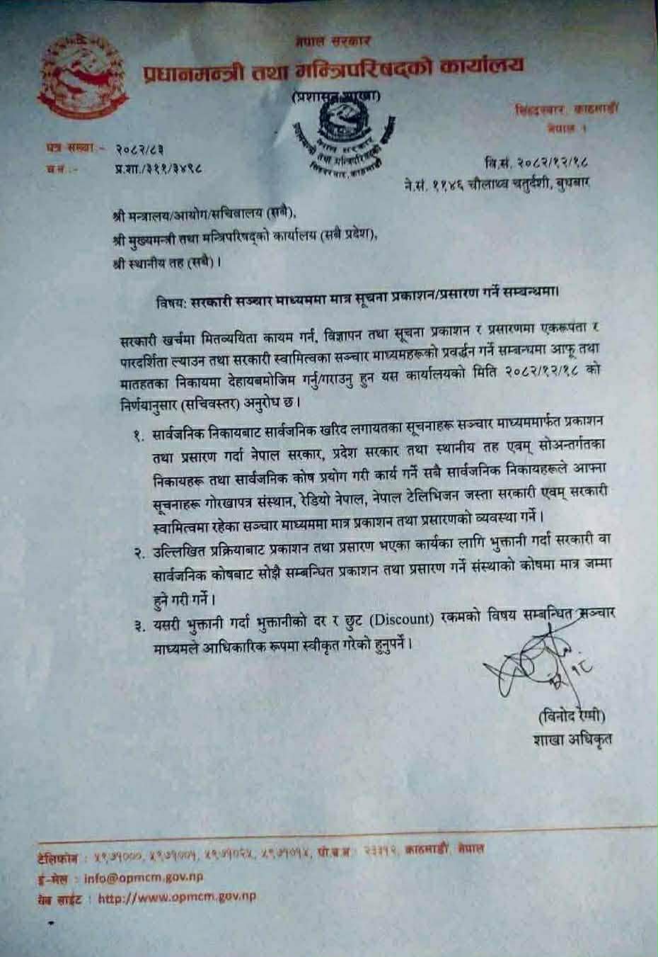 . From now on, information including public procurement from public bodies will have to be published and disseminated only through government media. The Office of the Prime Minister and Council of Ministers has decided to publish and disseminate information including public procurement only through the government media in order to maintain austerity in government expenditure and bring uniformity and transparency in advertisement and information dissemination.