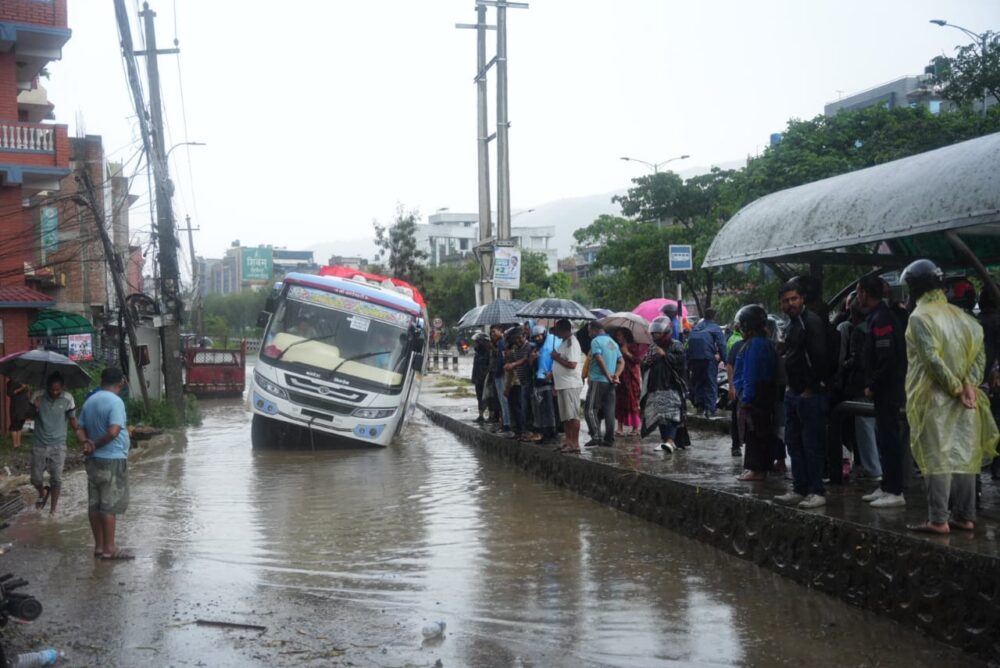 Bus stuck at Srijananagar on Koteshwor-Bhaktapur road section due to heavy rains